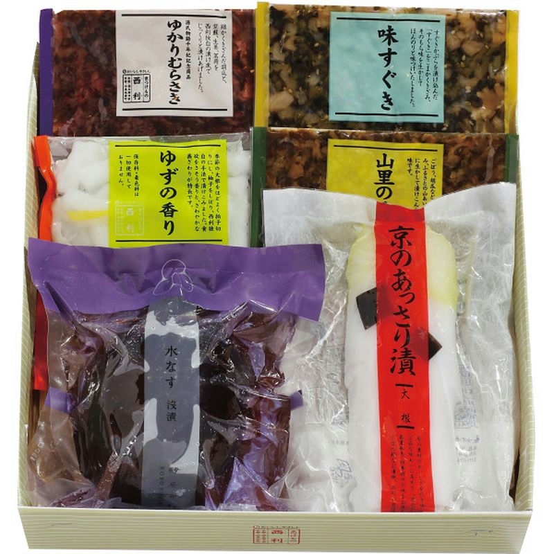 春夏:京のあっさり漬大根1/4割、水なす浅漬1個、ゆかりむらさき40g、味すぐき40g、山里の香り40g、ゆずの香り50g
