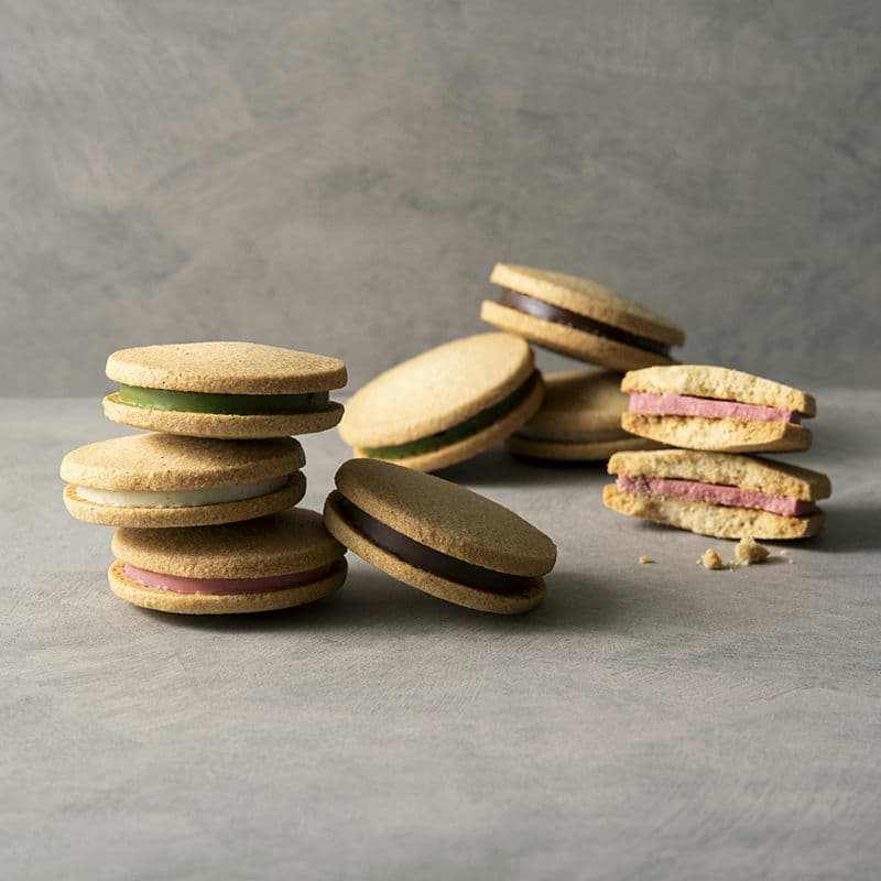 「梅いちご」「抹茶ゆず」など個性ある味わいのチョコレートをシンプルなクッキーでサンドしました。