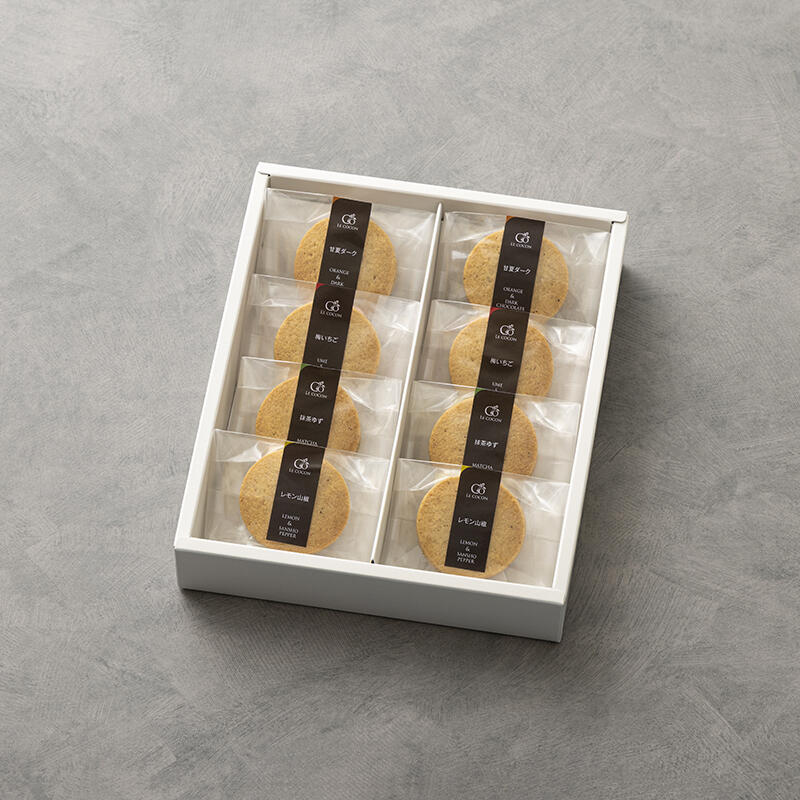 内容量:ショコラサンド(レモン山椒・梅いちご・甘夏ダーク・抹茶ゆず)×各2
