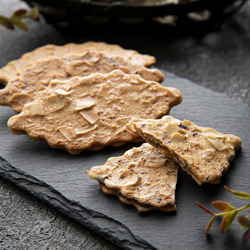香ばしいナッツをたっぷり敷き詰め、薄く焼き上げた生地に、チョコレートをサンド。