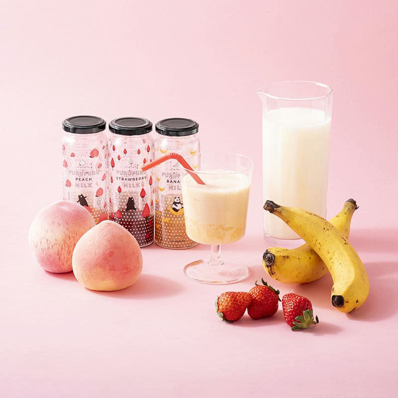 フルーツジュレの入ったボトルにミルクを注ぎ、ふるふると振ってから味わうドリンク。大野農園が厳選したいちご、もも、バナナの豊かな甘みと香りをご堪能いただけます。