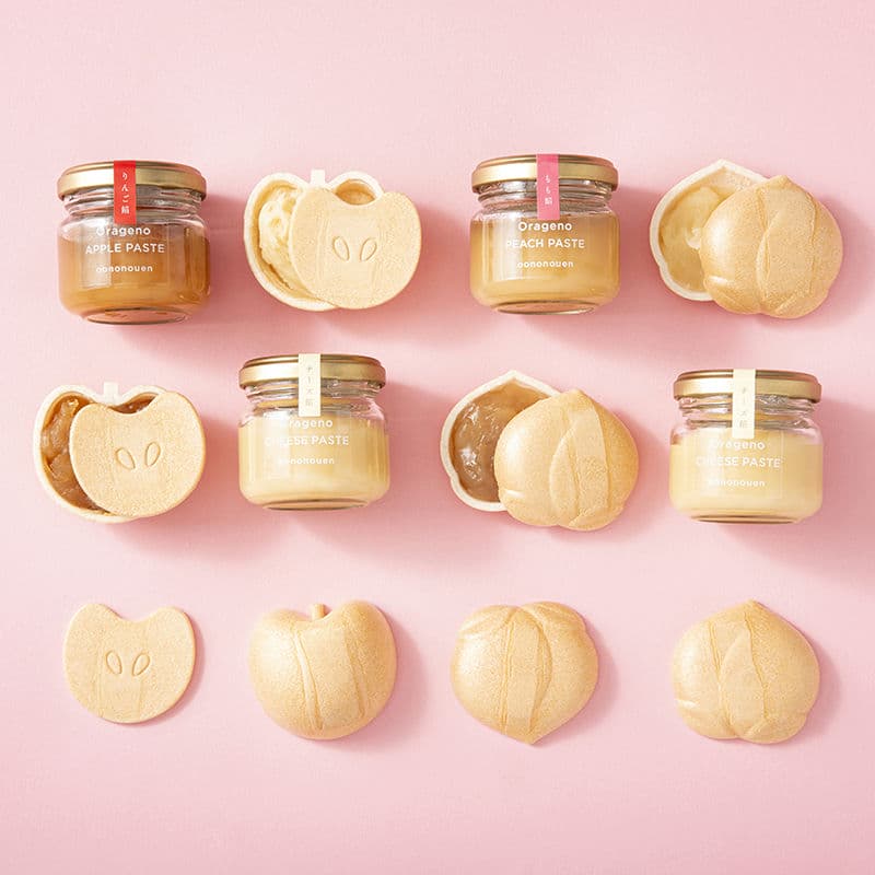 「りんご」と「もも」をかたどった、ぽってりとかわいらしいモナカ。