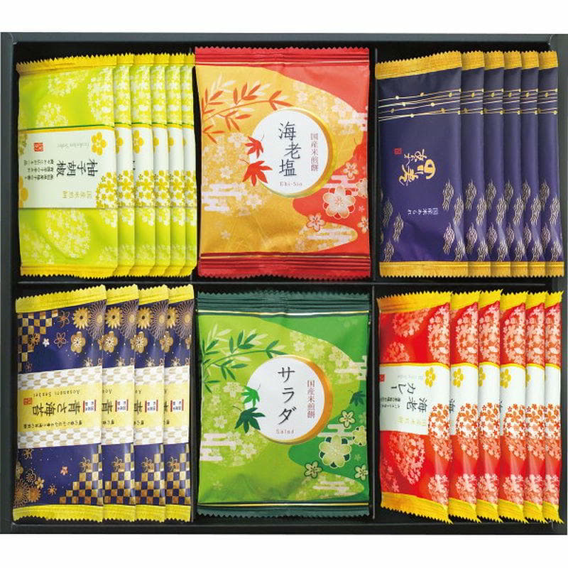 のり巻あられ×6、柚子胡椒煎餅×6、海老カレー煎餅×6、青さ海苔煎餅×4、海老塩煎餅×3、サラダ煎餅×3