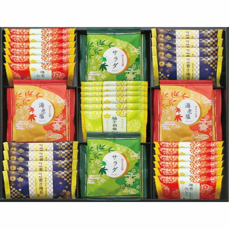 海老カレー煎餅×12、青さ海苔煎餅×8、海老塩煎餅×6、サラダ煎餅×6、柚子胡椒煎餅×6