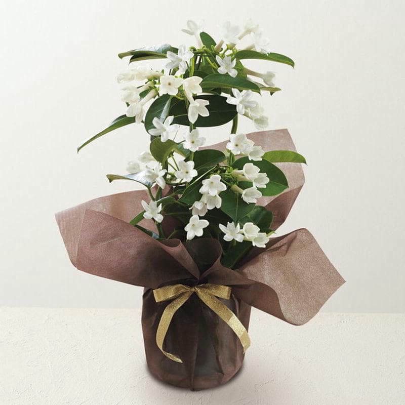 さわやかな甘い香りと清楚な花姿が人気の、マダガスカルジャスミンの鉢植えです。