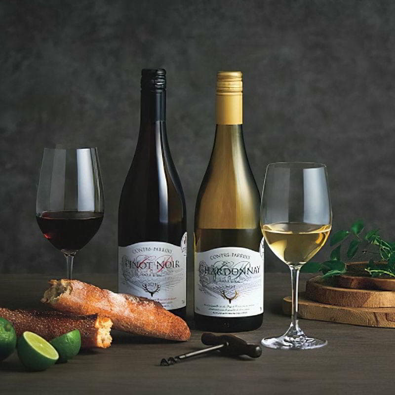 華やかな果実味と爽やかな酸味が魅力のシャルドネと、軽やかな味わいと果実の香りのピノ・ノワールがセットになっています。芳醇な香りと上質な味わいは、食卓を華やかに彩り、至福のひとときを演出してくれます。