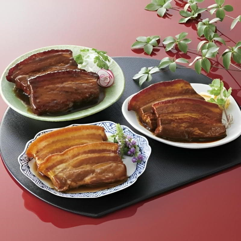 現品・内容・サイズ・材質: 豚角煮(だし仕立て・香味醤油仕立て・味噌仕立て)各130g×各2