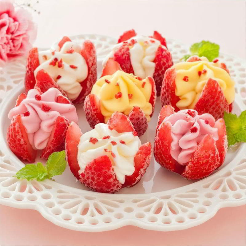 花のように開いた博多あまおうの中に練乳、イチゴ、マンゴーの3種類のアイスを絞り、苺のフリーズドライをトッピング。彩りも味わいも華やかなアイスデザートです。父の日のメッセージをつけてお届けいたします。