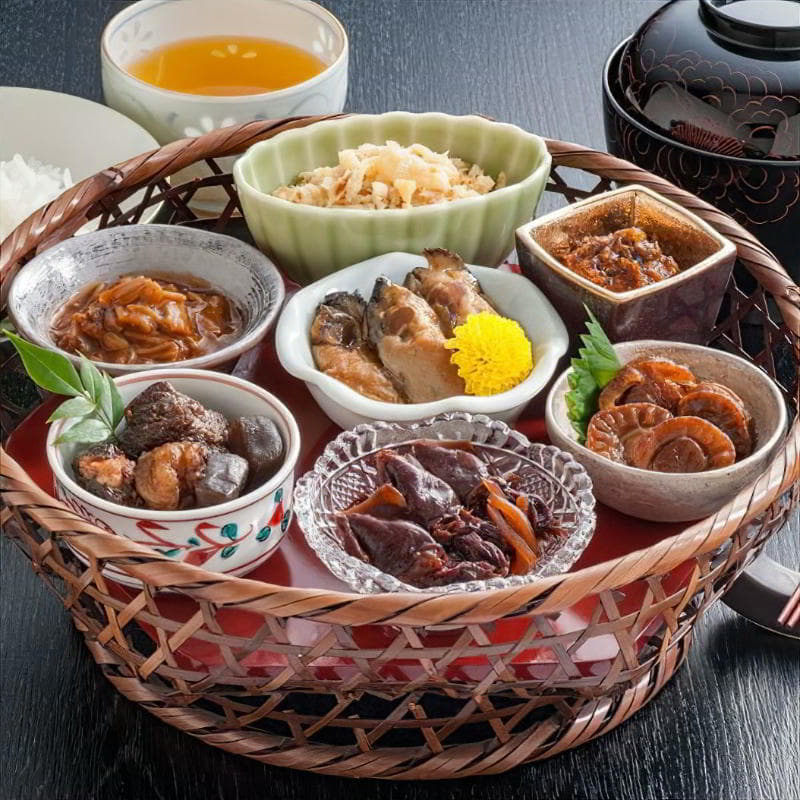 現品・内容・サイズ・材質: なめ茸明太味・九条ねぎ味噌各60g×各1、帆立しぐれ煮・牛すじ肉とこんにゃくの旨煮・かき浜焼・ほたるいかしぐれ煮各50g×各1、真鯛ほぐし身30g×1(計7)※メッセージブーケ付