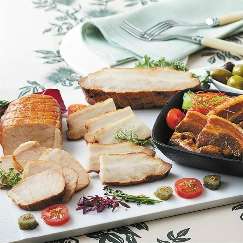 一本ずつロースターで焼き上げた「つるし焼豚」、秘伝のたれが芯までしみ込んだ「豚角煮」、しっとり柔らかな「ロース焼豚」の3種が詰め合わせになっています。