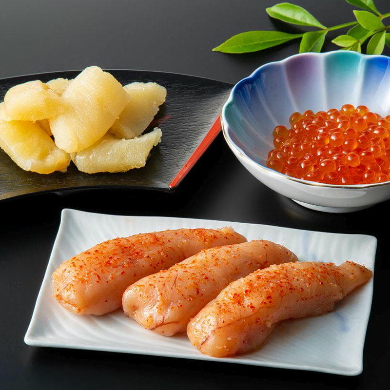 北海道知床半島周辺海域で水揚げされた鮭を独自の調味液で丹念に漬けこんだいくらと喜多屋の清酒と厳選された国産の柚子、ラウス産の昆布を使用した福岡でもトップクラスの品質の「やまや」の明太子、また醤油味の味付け数の子をセットにしました。それぞれのもつ風味豊かな味わいをどうぞご賞味ください。