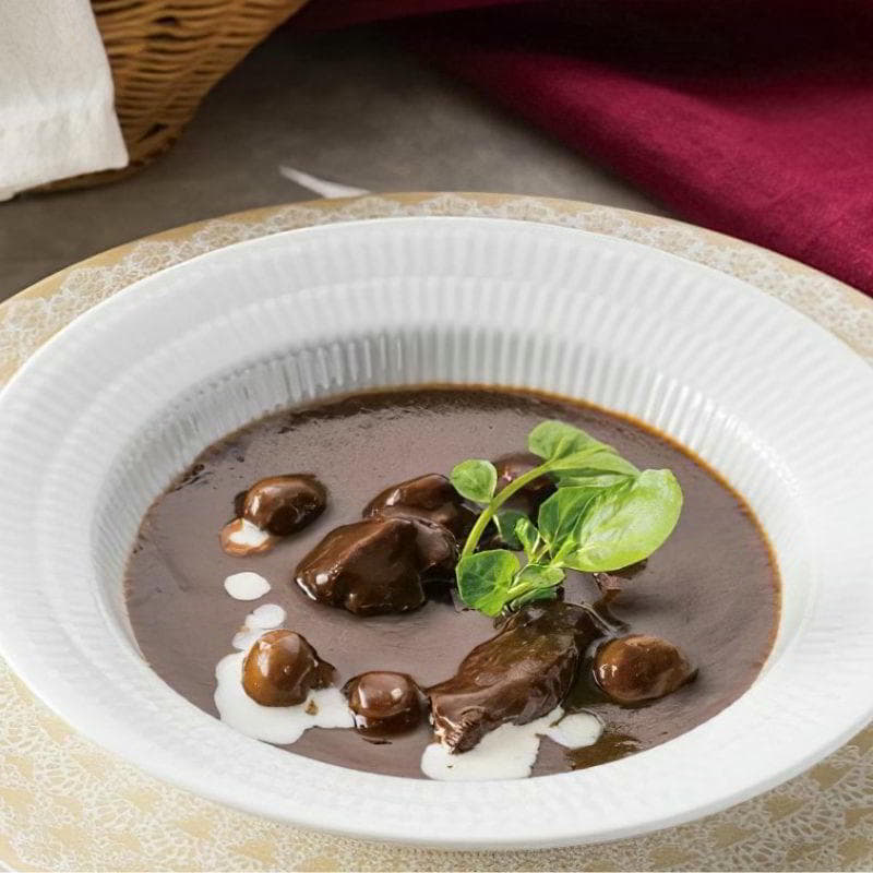 六本木リューズ飯塚シェフが監修する濃厚な味わいのビーフシチュー。赤ワインを効かせたデミグラスソースでじっくり煮込み、風味豊かに仕上げました。ぷりぷりのマッシュルームと牛肉の旨みが詰まった、本格フレンチのビーフシチューをお届けします。