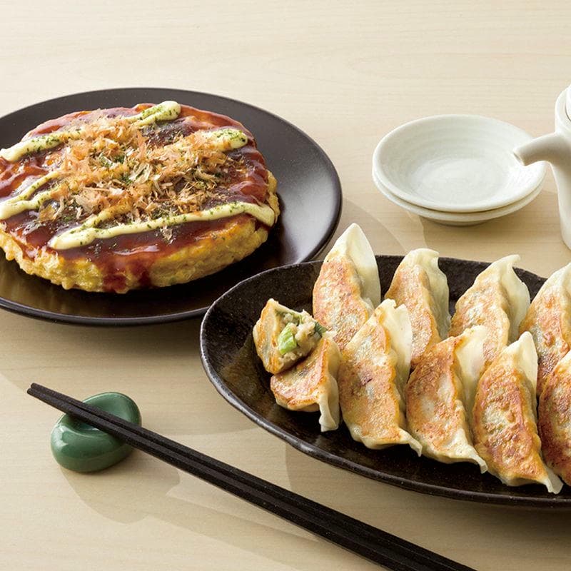メディアの冷凍お好み焼きランキングで1位を獲得したお好み焼きは低添加物で、冷凍とは思えないクオリティです。海鮮焼ともちチーズ玉の2種類が入っております。ねぎ餃子は大阪産のネギを使用しておりタレ無しでも味わえる本格餃子です。
