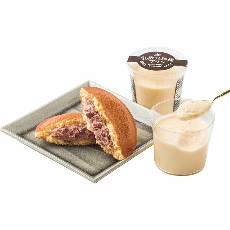 北海道産の牛乳を使用しとろける食感に仕上げたプリンと、程よい甘さの小豆にホイップクリームをブレンドしたなめらかな餡のどら焼きを詰合せにしました。