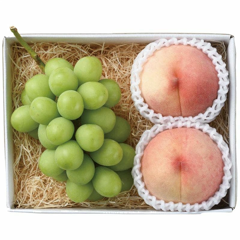 現品・内容・サイズ・材質: 山梨県又は長野県又は福島県産桃約225g×2玉・山梨県又は長野県産シャインマスカット約450g×1房