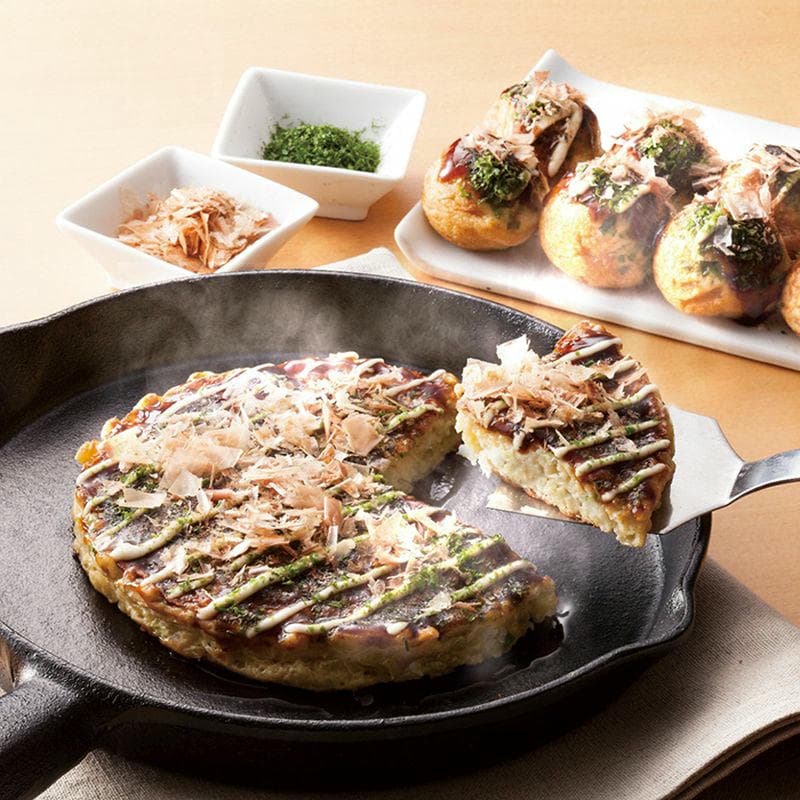 大阪千日前にて1973年創業のお好み焼の名店「千房」の味をご家庭で。千房オリジナルのお好み焼ミックス粉を使って、ふっくらと焼き上げたお好み焼豚玉ともちチーズに醤油味のねぎ焼と、生地をとろっと仕上げたたこ焼の4種類をセットにしました。電子レンジで温めるだけで名店の味をご家庭でお楽しみいただけます。