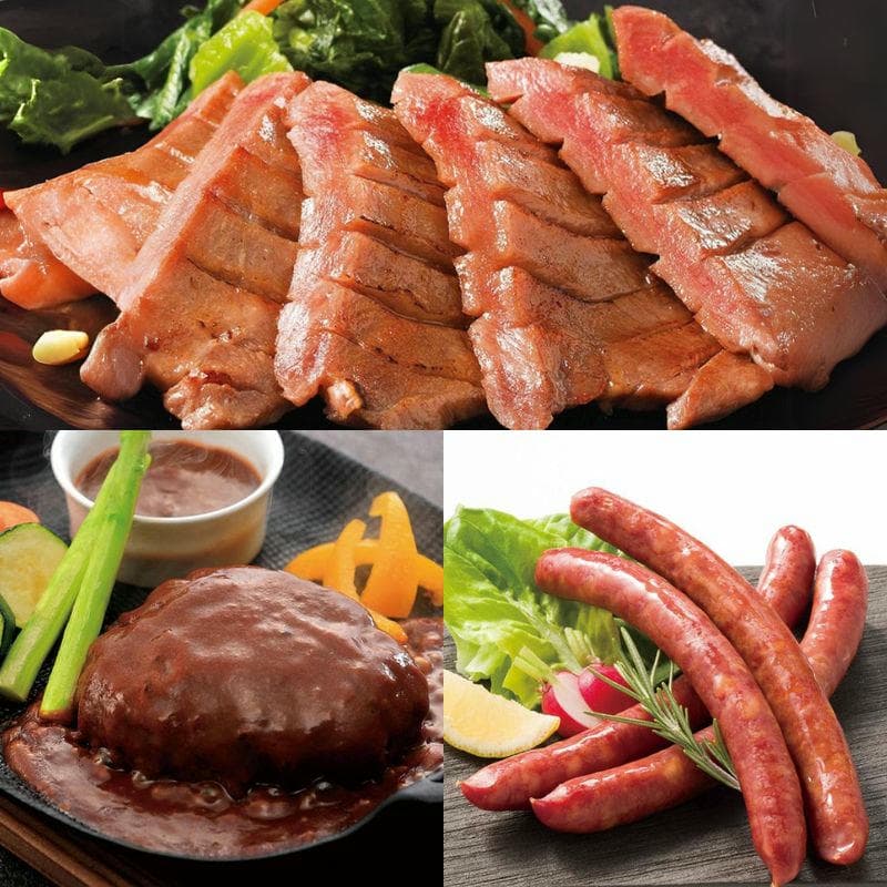 現品・内容・サイズ・材質: 牛たん真空パック(塩味)100g・牛たんおかず120g(塩味・味噌味)・牛たんハンバーグ200g(デミソース・和風ソース)・おつまみ牛たんペッパー50g・牛たんソーセージ120g各1個