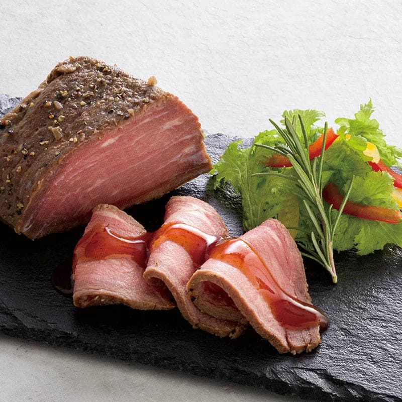 ニュージーランドの広大な大地の中で牧草のみで飼育されたグラスフェッドビーフを使用した柔らかなローストビーフ。引き締まった赤身で凝縮した肉本来の旨味を味わえます。真空加熱でじっくり焼き上げ、中はしっとりと仕上げました。贅沢素材でもあるトリュフをつかった特製ソース付き。