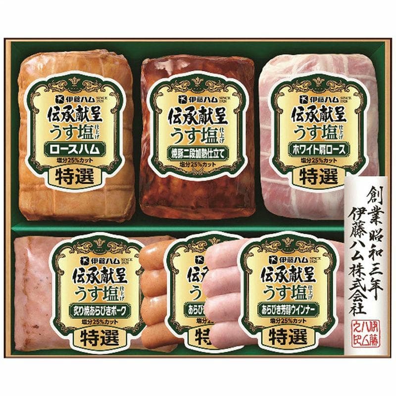 現品・内容・サイズ・材質: 特選(ロースハム360g・ホワイト肩ロース180g・炙り焼あらびきポーク160g各1本・あらびき芳醇ウインナー80g・あらびき燻しウインナー80g各1個)・焼豚二段加熱仕立て160g×1本