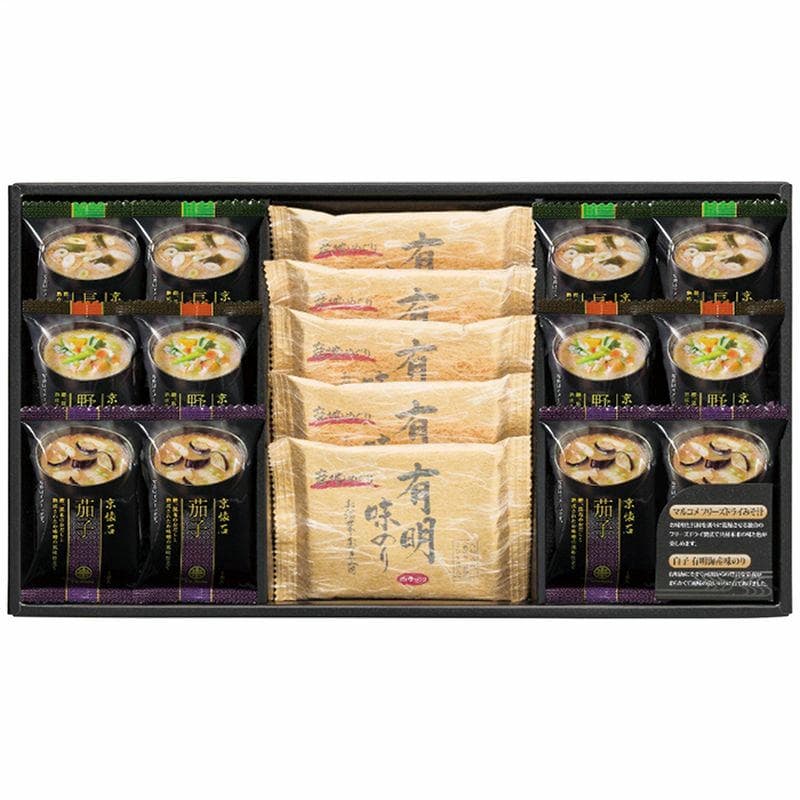お湯を注ぐだけで本格的な味わいのマルコメフリーズドライ味噌汁と、白子有明海産味のりの詰合せです。
