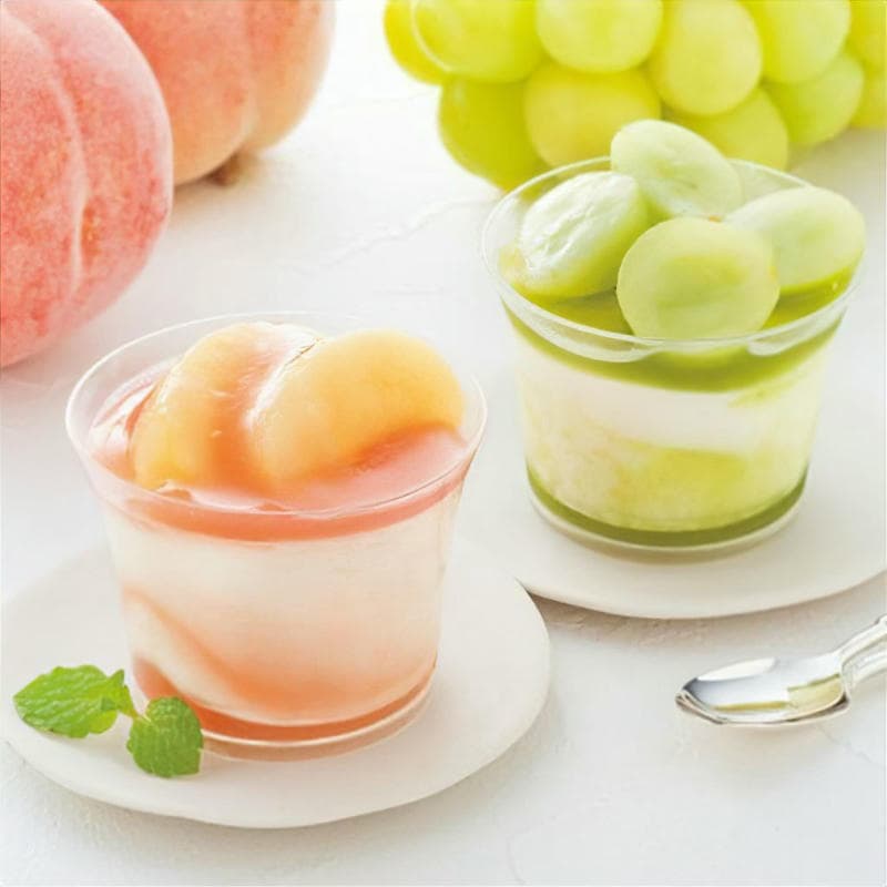 芳醇な香りと甘みが広がる白桃と、爽やかで上品な甘さが特徴のシャインマスカットの2種類が楽しめます。白桃にはバニラアイス、シャインマスカットにはミルクアイスを使用。ひんやりとした果肉と美味しさがギュッと詰まった果汁ソースが絡み合います。暑い夏の贈り物に喜ばれるギフトです。