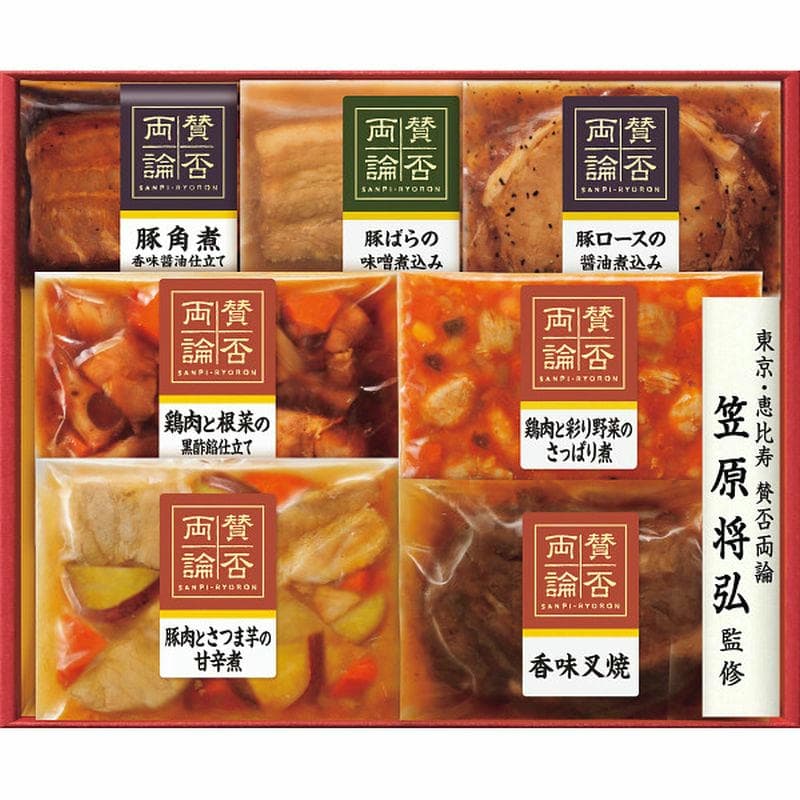 賛否両論(鶏肉と根菜の黒酢餡仕立て185g、香味叉焼180g、豚肉とさつま芋の甘辛煮・鶏肉と彩り野菜のさっぱり煮各150g、豚角煮香味醤油仕立て130g、豚ロースの醤油煮込み・豚ばらの味噌煮込み各70g)