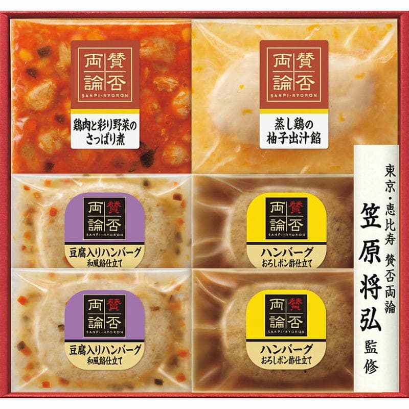 賛否両論(ハンバーグおろしポン酢仕立て(豚肉・牛肉使用)・豆腐入りハンバーグ和風餡仕立て(鶏肉使用))各120g×各2、蒸し鶏の柚子出汁餡・鶏肉と彩り野菜のさっぱり煮各150g