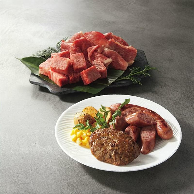 山形県産おぐに短角牛と米澤一番育ち豚ハンバーグ(牛肉・豚肉使用)100g×3、山形県産おぐに短角牛と米沢牛牛脂入りソーセージ150g×2、山形県産米沢牛切落し200g、山形県産米沢牛サーロインサイコロステーキ150g