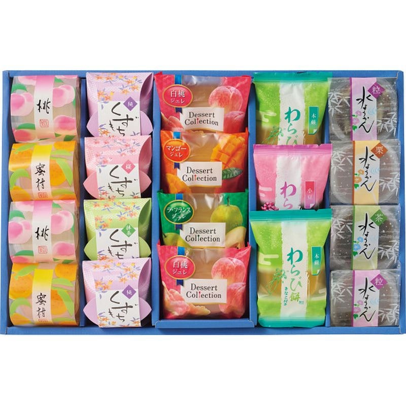 くず餅83g×4(純×2、桜・抹茶×各1)、水ようかん78g×4(粒×2、栗・茶×各1)、桃ゼリー・蜜柑ゼリー70g×各2、わらび餅81g×3(本蕨×2、小豆×1)、ジュレ65g×4(白桃×2、マンゴー・ラフランス×各1)