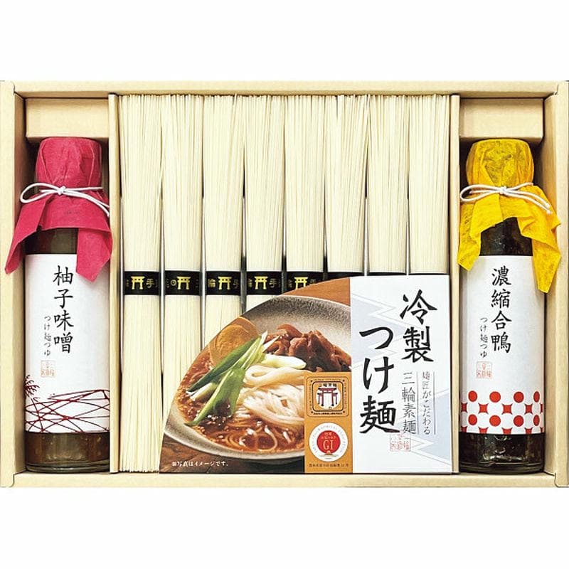 確かな技で一本一本丁寧につくる三輪素麺と、相性の良い冷製つけ麺つゆ(柚子味噌・合鴨)をご用意しました。