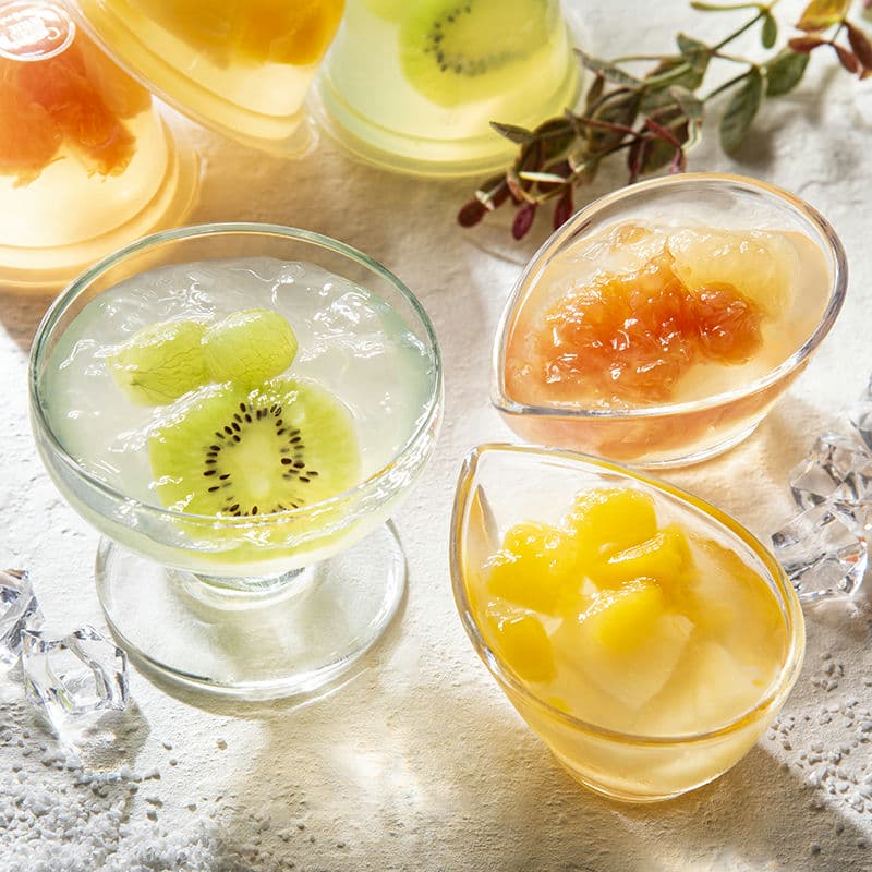 6種類のフルーツが楽しめる華やかでジューシーなゼリー。レモン果汁のゼリー液にキウイ・ぶどう・グレープフルーツ(2種)・マンゴー・パインを掛け合わせ、甘すぎない大人なゼリーに。光に反射して艶めく姿がかわいく、ギフトにもぴったりです。