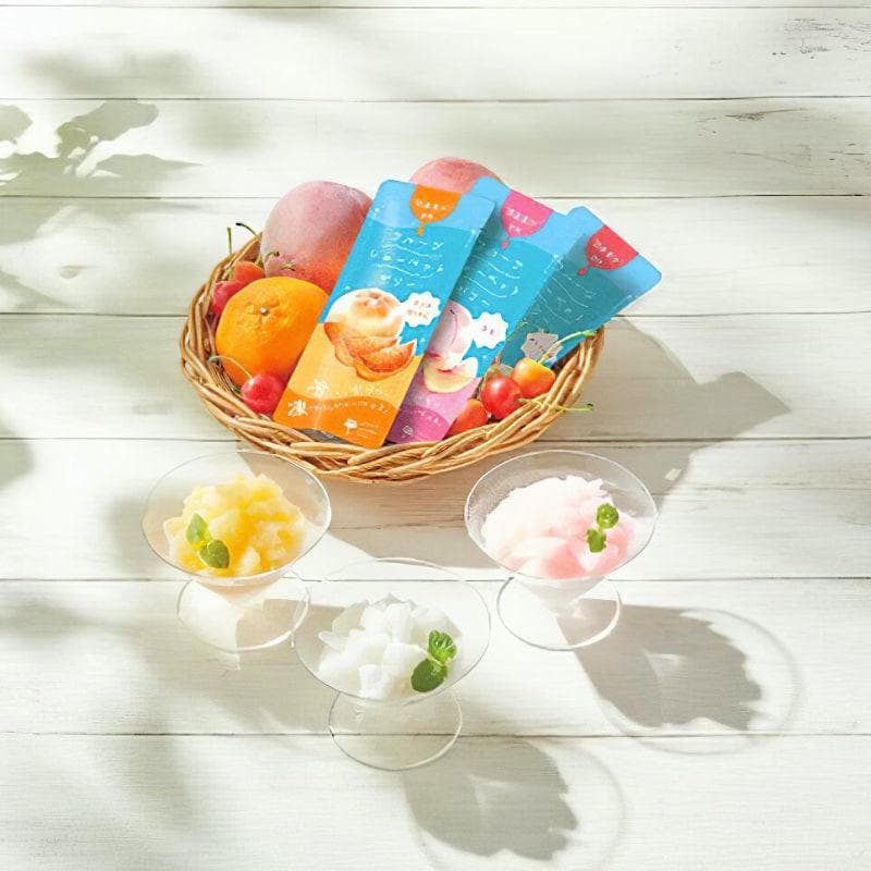 冷やしてぷるん、濃厚食感なゼリー。凍らせてシャキっと、爽やかシャーベット。もも、さくらんぼ、なつみ&ぽんかんの国産果汁で作ったシャーベットゼリー。冷やす、凍らせるの2種類の食べ方が楽しめます。