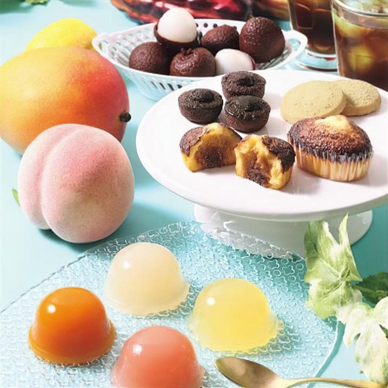 焼きティラミス×5、ハイカカオブラウニー・芳醇チーズサブレ×各4、カカオフルーツゼリー×6(ライチ・マンゴー×各1、桃・レモン×各2)
