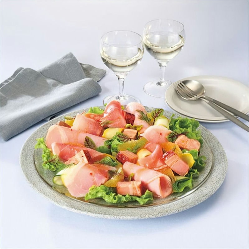 特選(ホワイトももハム220g、ロースハム60g)、たれ漬けばら焼豚165g、しっとりロース生ハム45g、オリーブドレッシング60ml