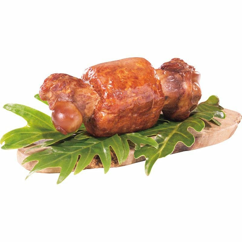 豚のゲンコツ(大腿骨)に、味付けした粗挽き肉(豚肉・牛肉)を「マンガ」に出てくる肉風の形にアレンジしました。粗挽き肉は食感を出すために2種類のサイズで配合し、桜のチップでスモークをかけ、原始人が食欲をそそる見栄えに仕上ています。