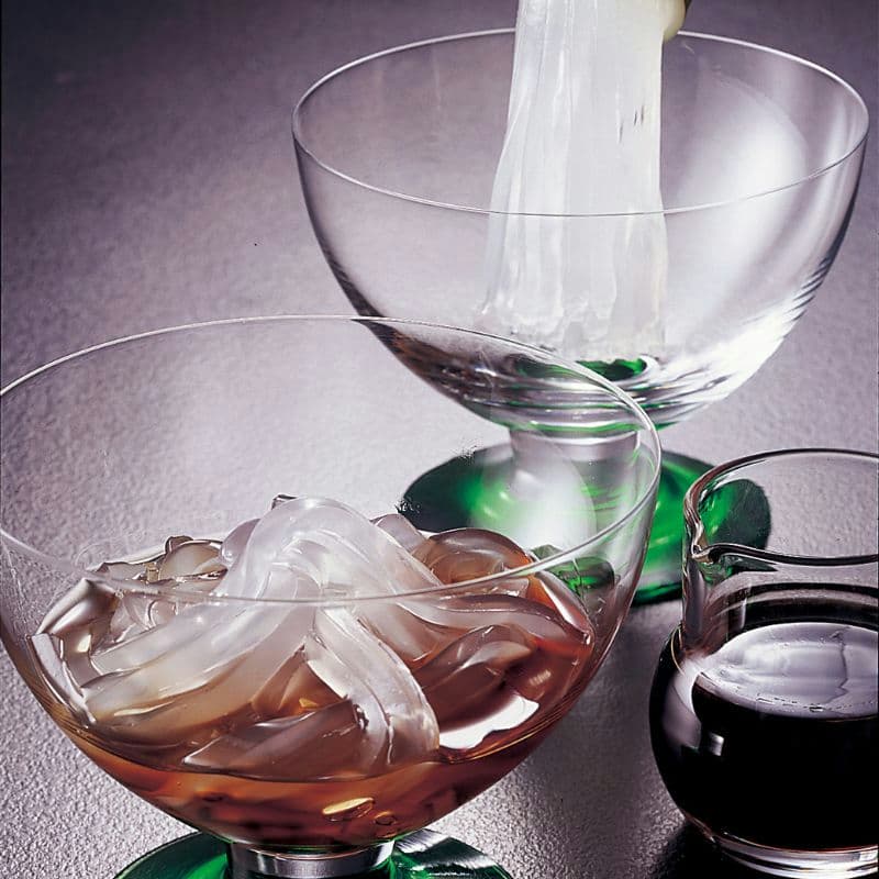 竹筒型容器に入った風流で遊び心のあるくずきりです。ツルルンとした喉越しのくずきりと、濃厚な黒蜜が絶妙にマッチ。事前に冷やしておき、付属の押し棒で突き出してお召し上がりください。夏にぴったりの涼しげなデザートです。