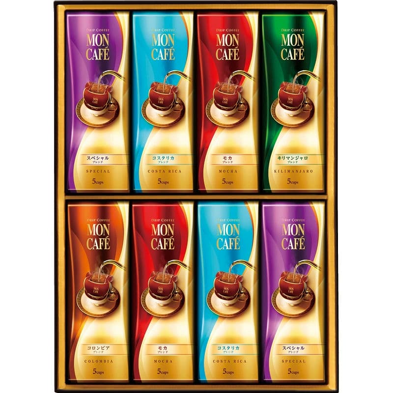 【セット内容】モカブレンド(8g×5p)・スペシャルブレンド・コスタリカブレンド(各7.5g×5p)×各2、コロンビアブレンド・キリマンジャロブレンド(各8g×5p)×各1