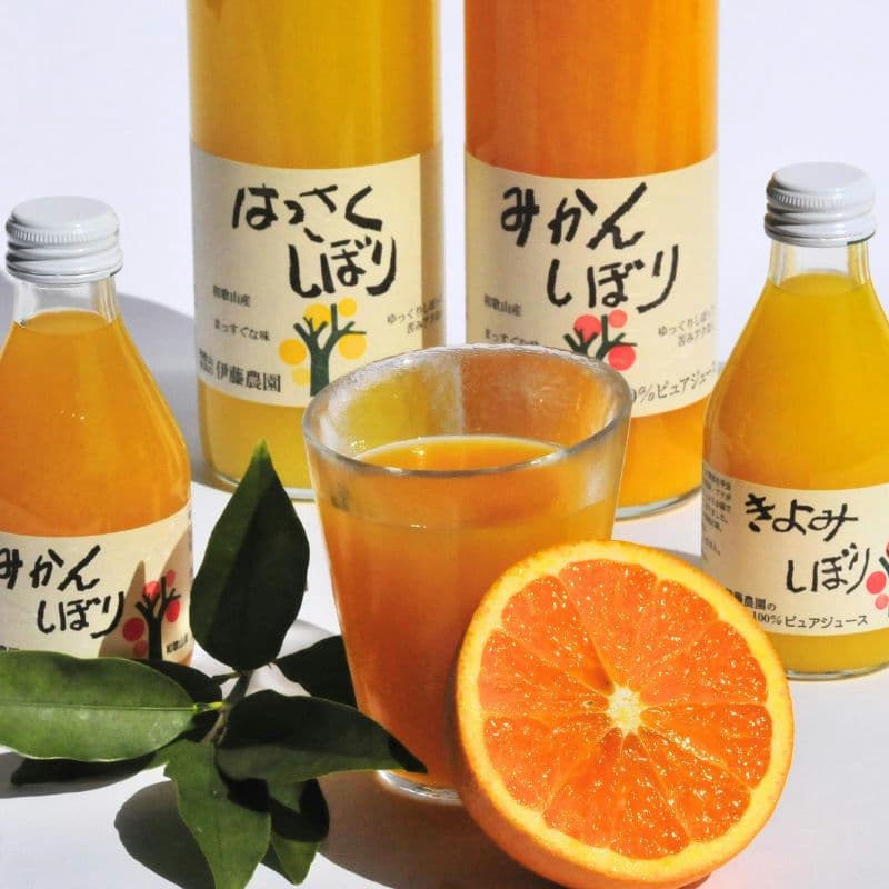 伊藤農園独自製法で搾ったストレートジュース。和歌山県産柑橘の味わいがたっぷり楽しめます。たっぷり入った大瓶と飲み切りサイズのセット。