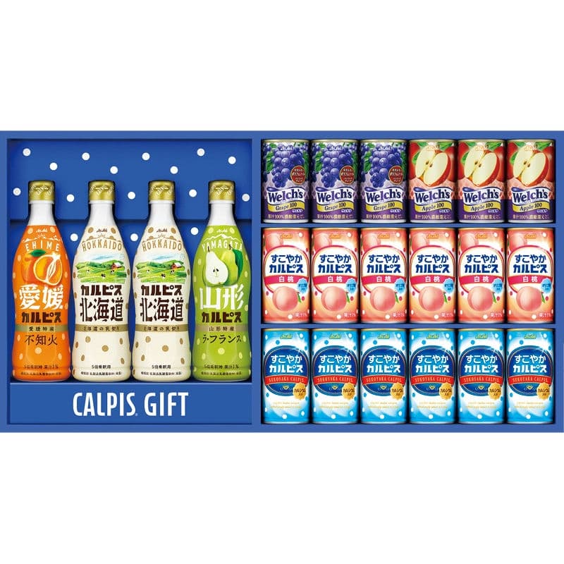 【セット内容】すこやかカルピス・すこやかカルピス白桃(各190g)×各6、ウェルチ100(コンコードグレープ・アップル)(各160g)×各3、カルピス北海道(470ml)×2、カルピス(愛媛特産不知火・山形特産ラフランス)(各470ml)×各1