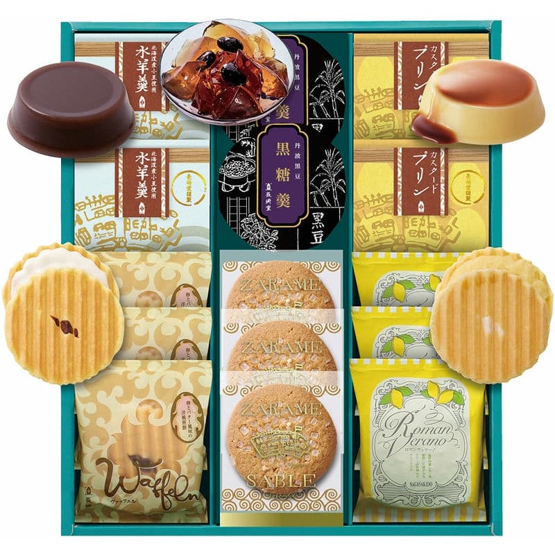 【セット内容】ヴァッフェル・レモンヴァッフェル・ざらめサブレ×各3、水羊羹・黒糖黒豆羹・プリン×各2
