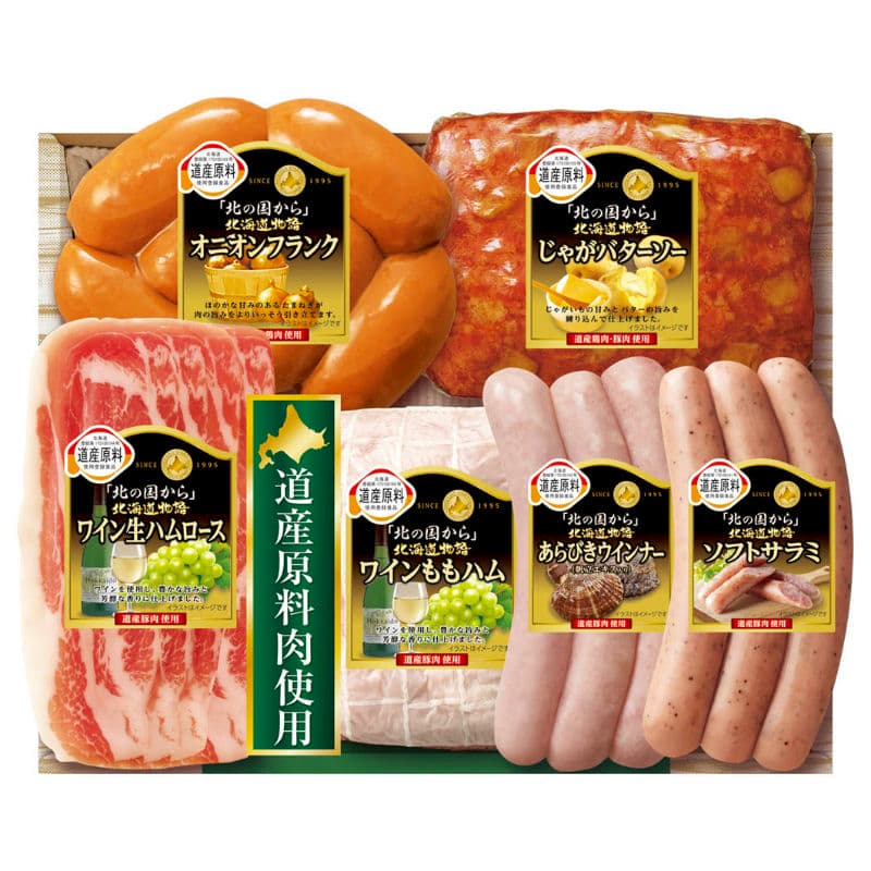 ワインモモハム130g、ワイン生ハムロース35g、じゃがバターソー180g、ソフトサラミ75g、あらびきウインナー(帆立エキス入り)75g、オニオンフランク180g