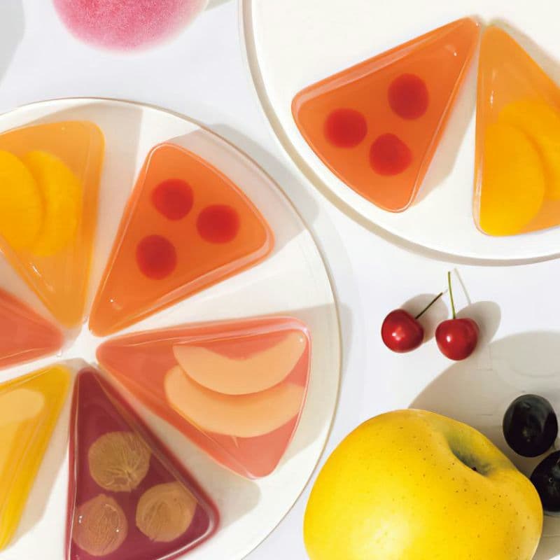 国内産の厳選された果肉を使用し、二層の異なる食感のゼリーで包み込んだ、贅沢な三角形のフルーツゼリーです。山形県産白桃や佐藤錦、岡山または山梨県産ピオーネ、愛媛県産いよかん、長野県産シナノゴールドなど、各地の新鮮な果実が味わえます。ジューシーで豊かな果実感が広がるゼリーは、見た目にも美しく、特別な贈り物やおもてなしに最適です。食感の異なる二層ゼリーとフルーツの豊かな味わいをお楽しみください。