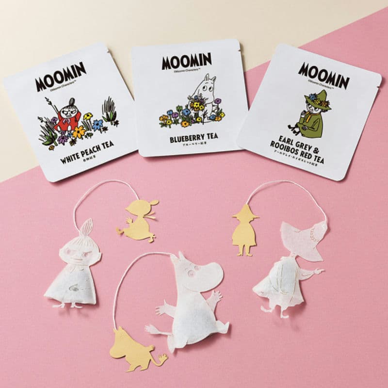ムーミン谷の仲間たちの形をしたかわいいフレーバーティー。甘酸っぱい香り広がるブルーベリー紅茶と、白桃紅茶、ノンカフェイン アールグレイ・ルイボスレッドの3種をセットで。