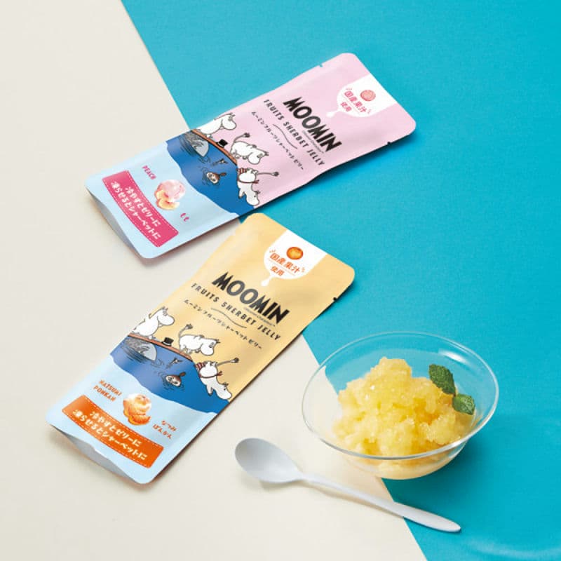 国産果汁を使用した、なつみ・ぽんかんとさくらんぼのシャーベットゼリーを「ムーミン」パッケージでお届け。常温時はゼリーとして、冷凍するとシャーベットとして二通りの食べ方を楽しめます。