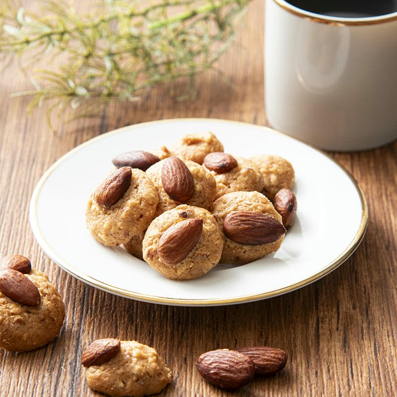 ローストしたアーモンドを生地に練り込み、さらにアーモンドをひと粒まるごとトッピング。カリッとはじけるナッツが香ばしい豊かな味わいのクッキーは、モロゾフが誇るロングセラーです。