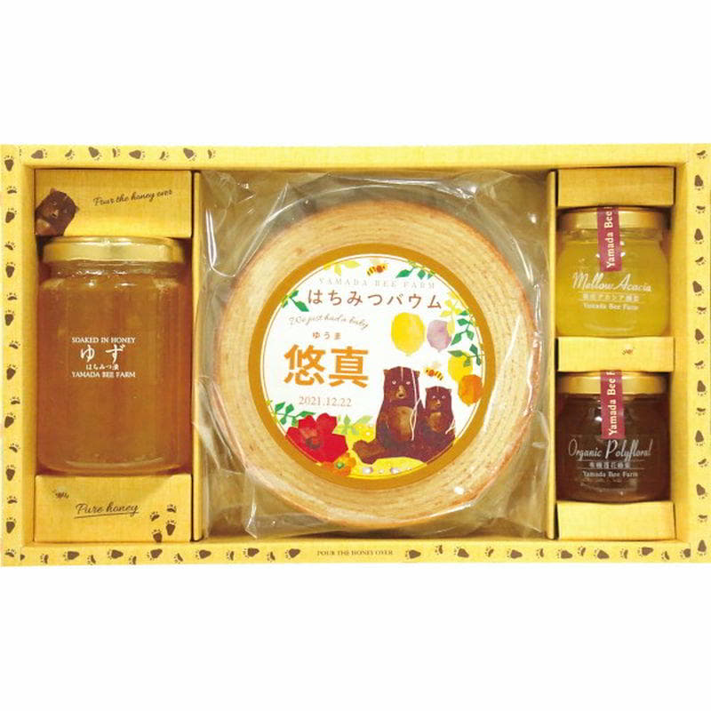 はちみつバウム(直径約13cm)、アカシア蜂蜜50g、有機百花蜂蜜50g、ゆずはちみつ漬200g