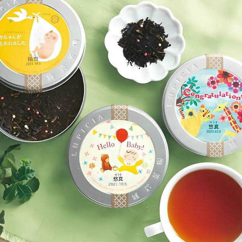 赤ちゃんの名前と誕生日を入れたオリジナルの缶で、お祝いにぴったりの華やかなフレーバーティーをお届けします。