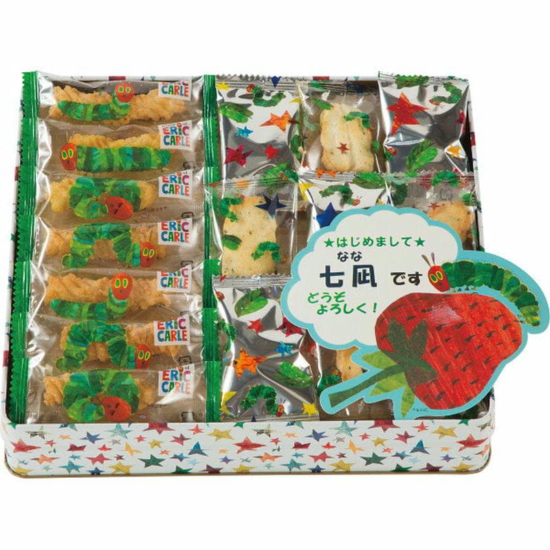 人気絵本『はらぺこあおむし』のかわいいイラストカードに、お名前を入れて贈れるおかきセット。