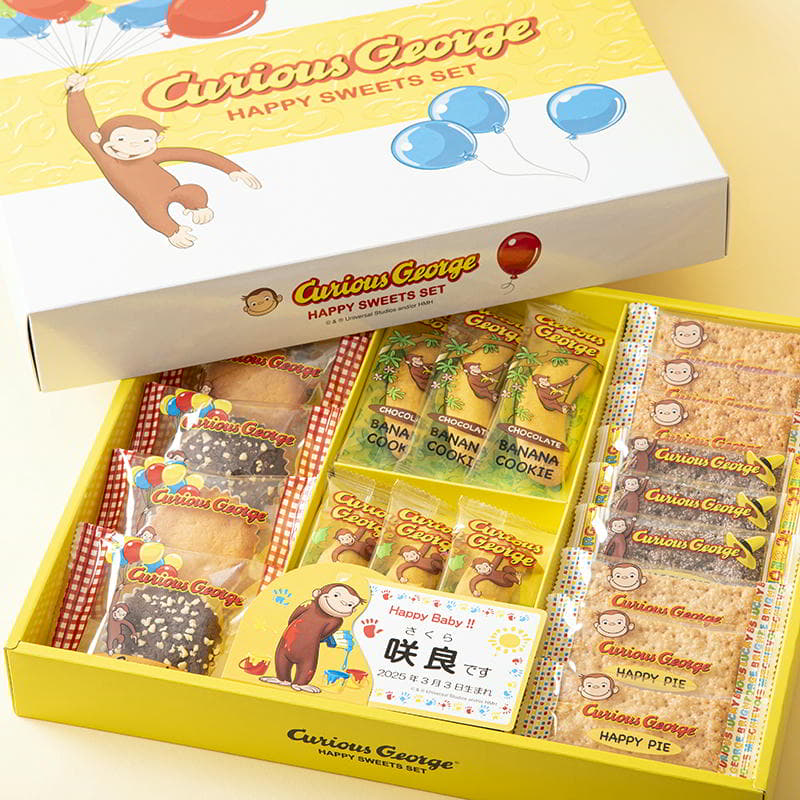世界中で愛されるキャラクター『おさるのジョージ』の出産内祝い用ギフト。赤ちゃんのお名前入りカードを、かわいいスイーツセットとともにお届けします。ジョージの世界がギュッと詰まった、もらって思わず笑顔になる贈り物です。