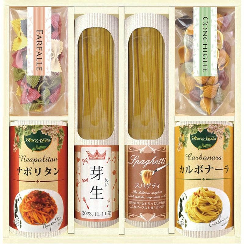 スパゲティ(200g)×2、自然色パスタ(ファルファーレ40g)×1、自然色パスタ(コンキリエ60g)×1、パスタソース(ナポリタン・カルボナーラ)140g×各1